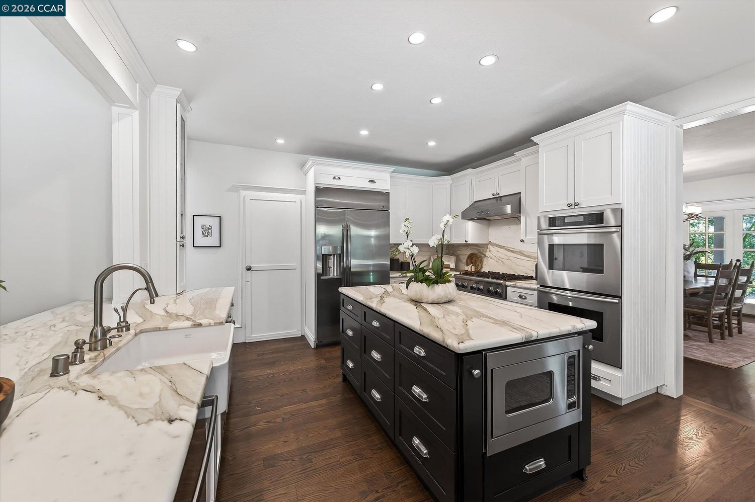 Standout Home in Blackhawk designed by Dahlin Group Multiple French doors and welcoming wraparound porch set the tone for this iconic home with timeless character. Enjoy hardwood floors, extensive molding & decorator features Remodeled kitchen w/gorgeous marble counters, island, & pantry, opens seamlessly to family room, wet bar & private backyard.